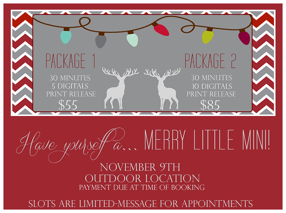 After much debate and many requests I have decided to do Christmas Minis. I will be posting on facebook tomorrow morning! I hope to see everyone there!